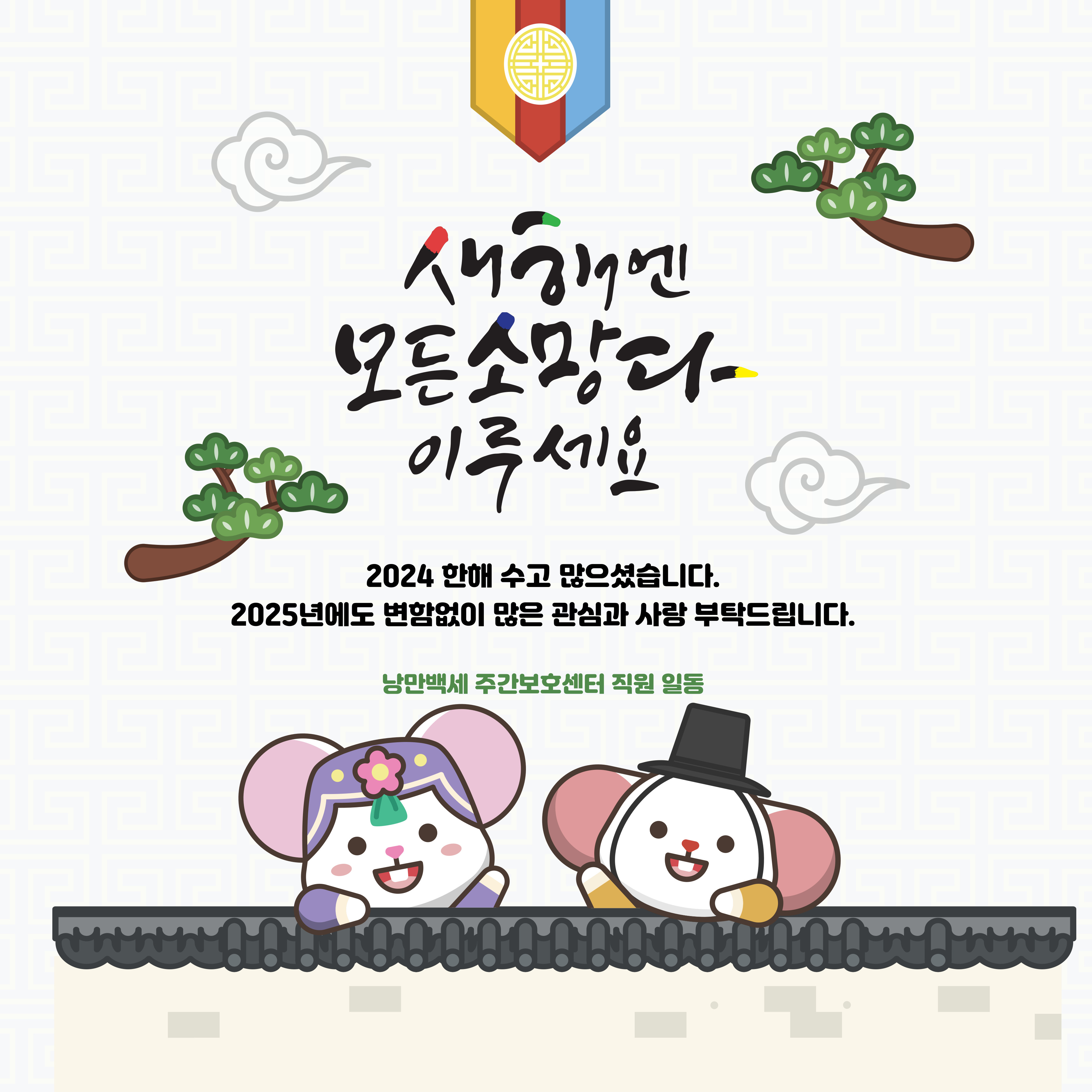 새해에는 가족 모두가 건강하시고, 평안과 기쁨이 가득하시길 기원합니다. 앞으로도 저희 낭만백세 주간보호센터의 모든 직원들은 어르신들의 일상에 소소한 행복과 낭만을 선물하기 위한 든든한 동반자가 되겠습니다. 한 해 동안 보내주신 신뢰와 사랑에 다시 한 번 감사드리며, 다가오는 새해에도 좋은 일들만 가득하시길 바랍니다. 늘 저희 센터와 함께해 주셔서 진심으로 감사합니다.